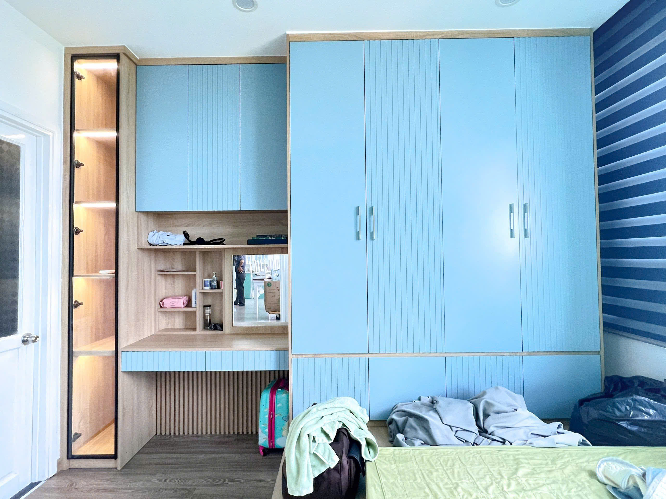 Phòng ngủ được thiết kế theo phong cách tối giản nhưng vẫn đảm bảo sự tiện nghi và thoải mái, Thi Công Nội Thất Trọn Gói là điều mà chúng tôi đang hướng đến. Giường bệt tích hợp ngăn kéo giúp tối ưu không gian lưu trữ. Tường đầu giường được bọc nệm màu xanh nhạt, tạo cảm giác mềm mại và thư giãn. Hệ tủ quần áo với thiết kế cửa lùa giúp tiết kiệm diện tích mà vẫn đảm bảo công năng sử dụng. Bàn trang điểm nhỏ gọn, tích hợp với tủ quần áo giúp tận dụng không gian một cách hiệu quả. Cửa sổ lớn giúp đón ánh sáng tự nhiên, mang lại cảm giác thoáng đãng và dễ chịu.