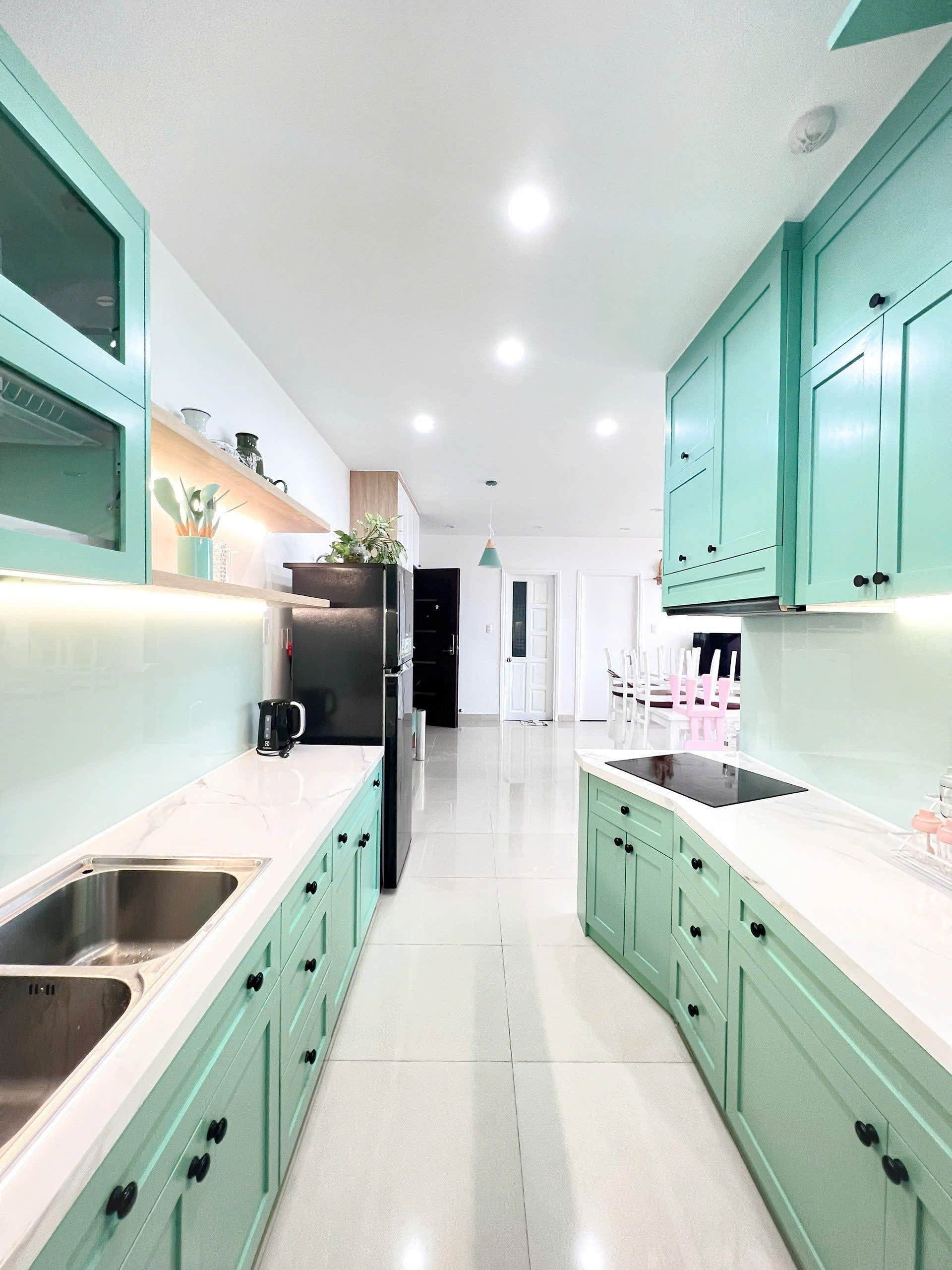 Bếp trong căn hộ KT’ Apartment được thiết kế Thi Công Nội Thất Trọn Gói theo phong cách mở, kết nối liền mạch với phòng khách và khu vực ăn uống. Điều này không chỉ giúp tối ưu diện tích mà còn mang đến một không gian sinh hoạt chung đầy đủ tiện ích. Hệ tủ bếp màu xanh pastel kết hợp với gam màu trắng giúp không gian trở nên sáng sủa và nhẹ nhàng. Mặt bếp được làm từ đá trắng vân mây, không chỉ tạo sự sang trọng mà còn dễ dàng vệ sinh. Gạch ốp tường kiểu xương cá màu trắng làm nổi bật không gian nấu nướng, đồng thời giúp bảo vệ bề mặt tường khỏi dầu mỡ. Tủ bếp trên có cửa kính giúp gia chủ dễ dàng quan sát và sắp xếp đồ dùng. Các kệ mở bằng gỗ tự nhiên tích hợp đèn LED vừa giúp tăng công năng sử dụng, vừa tạo điểm nhấn cho không gian bếp. Bếp từ âm kết hợp với máy hút mùi hiện đại đảm bảo không gian luôn thông thoáng và sạch sẽ.